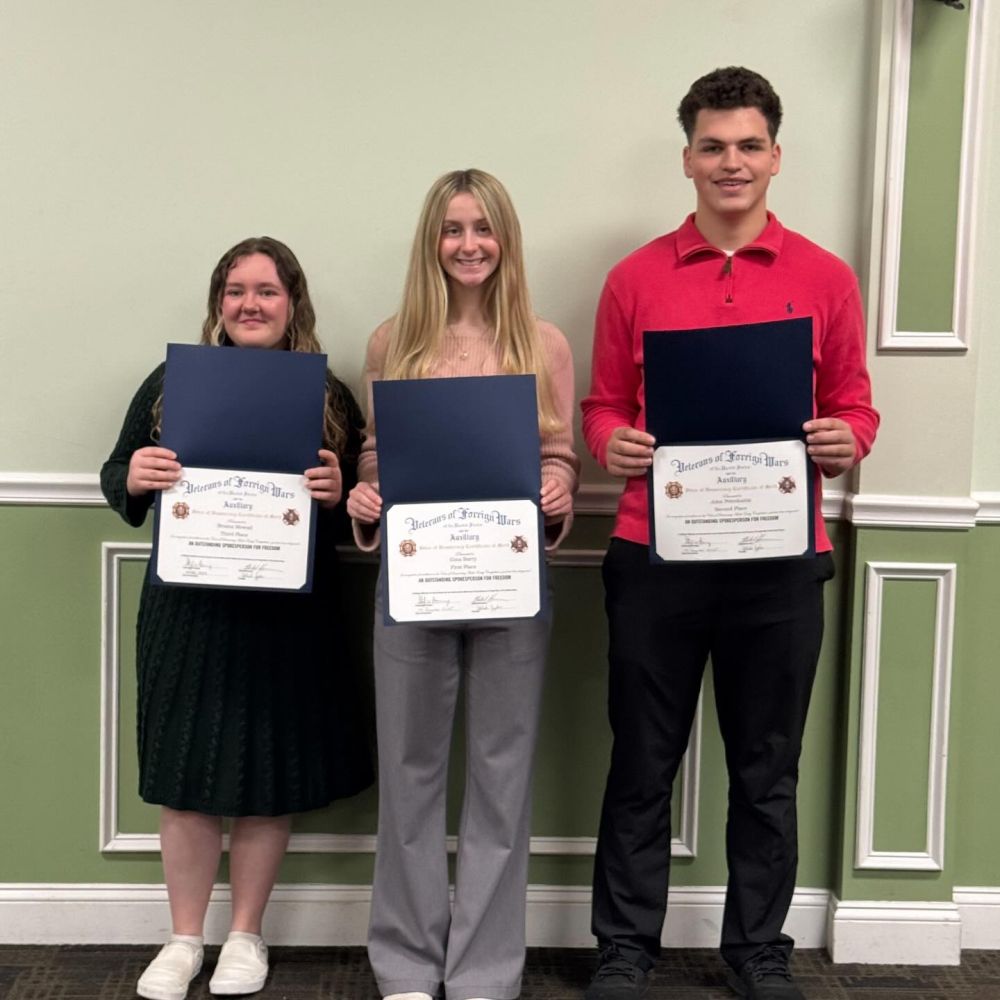 Congratulations to the recipients of this year’s Voice of Democracy Scholarships! Holy Cross students received all three awards: Gina Barry ‘26- First Place; John Petrokaitis ’26- Second Place; and Brianna Mowad ‘27- Third Place. Students submitted their essays on this year’s topic: “How are you showing Patriotism and support for our country?” They were honored by the VFW Post 201 Auxiliary on Sunday.